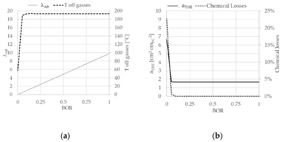Graphs reporting results of BOR study results: λAB and T off-gases (a) and ATHE and chemical losses (b).