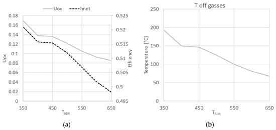 Figure 8 shows the study of TADR variation, where Figure 8a reports the use of oxygen and net efficiency variation while Figure 8b reports off-gases temperature. The variation of TADR from 350 °C to 650 °C moves the decomposition reaction from the stack to the ADR. The result is a decrease in Uox, since there is no cooling effect of the reaction inside the stack. Efficiency slightly decreases due to the effect of XNH3 in Equation (10).