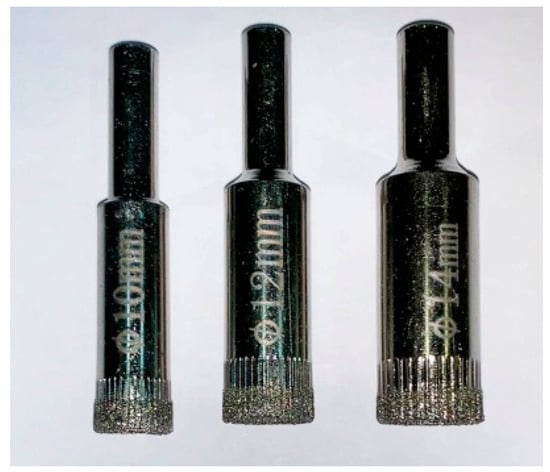 New red sandstone of the Permian period mined in the Clashach quarry (Elgin, Scotland, UK) was selected for this study. The strength of a sample was determined by the strength of its weakest part (a defect), and the larger the sample volume, the greater the probability of a defect [51]. To assess the scale effect on the strength properties of the rock, and for the subsequent comparison of the strength properties with the data obtained in experiments on dynamic loading, four types of samples of different sizes were prepared in accordance with industry standards [52,53]. The ratio of the specimens’ length to diameter was 2. Small samples (d = 7.5, 9.2, and 11.5 mm) were milled with diamond bits (Figure 1) at a rotation frequency of 500 rpm with constant water flushing.