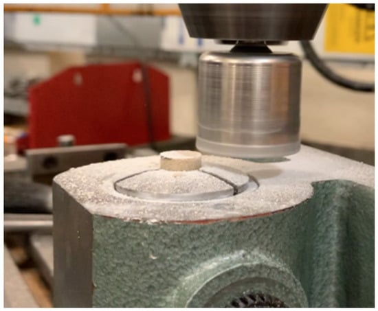 After coring, small cylindrical specimens were removed from the rock block, washed, and passed through a grinding procedure (Figure 2), where their end surfaces became parallel to each other and perpendicular to the axis of the specimen, which was necessary to ensure the maximum contact density between the plates of the stand in terms of loading and manner, as well as a uniform stress distribution in the sample. Samples on which defects were detected after processing were not used in subsequent experiments. When preparing samples with a diameter of 24.7 mm, a milling machine manufactured by ELE International Core Power Tools, model CX20-C3, was used. After milling, the samples were cut at the Cutrock & Brook Compton installation. Water was used as the washing and cooling liquid.