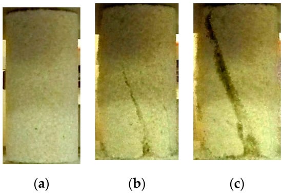 Fracture propagation in specimens of 24.7 mm in diameter during the UCS test. (a) a specimen without a fracture, (b) the beginning of fracture propagation, (c) a fractured specimen.