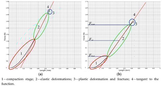 Classically, the Young’s modulus characterizes the ratio of the stress arising in the sample to its relative deformation under static and quasi-static loading, but the Young’s modulus determined under dynamic loading is usually called dynamic [57]. In our case, the sample was subject to dynamic action; accordingly, the obtained experimental data were used to calculate the dynamic Young’s modulus. Young’s dynamic modulus is defined as the ratio of stress and strain increments tangential to the strain–stress curve at zone 2 (Figure 4) [38]: