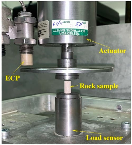 To studying the effect of dynamic loads on the mechanical properties of rocks, a special instrument was developed at the University of Aberdeen. The dynamic action on rock samples was carried out by an EXTREMA Magnetostrictive Electromechanical Transducer Model 250 µ actuator powered by the signal from a manual oscillator MOS-01 (CompactPower Titan series). The instantaneous force data were provided by the three-axis load sensor KISTLER 9027C. Accompanying data on the specimen’s deformation were recorded longitudinally by an eddy current probe (ECP). Signals from the sensors were directed to a workstation. A close view of a rock sample in the facility is shown in Figure 5.
