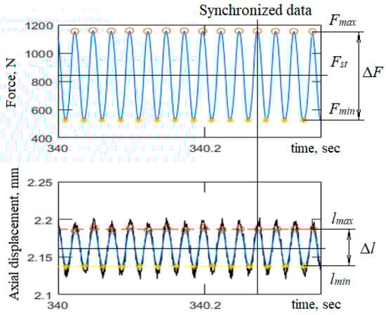 Under dynamic loading, the maximum sample displacement lmax corresponds to the maximum load Fmax, and the minimum displacement lmin corresponds to the minimum load Fmin (Figure 6). The difference between these increments is the displacement increment; thus, the sample strain increment is given by the formula