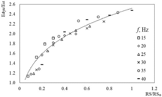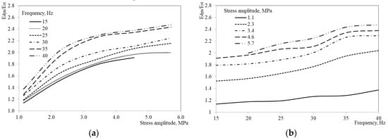 Experimental studies established that with an increase in the stress amplitude and frequency of dynamic action, the dynamic Young’s modulus increases. In this case, the greatest dispersion of Young’s modulus was observed at a stress amplitude from 1 to 3 MPa. At stress amplitudes of more than 3 MPa, the Young’s modulus dependence becomes monotonic. The dependence of Young’s modulus on the frequency of dynamic action (Figure 8b) has a smoother form. Similar results regarding the dispersion behavior of the dynamic Young’s modulus were obtained in [42,46,47].