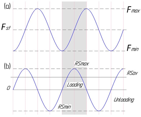 where RS is the stress rate, MPa/s; and f is the frequency. An explanation of the stress and stress rate behavior is shown in Figure 8. A positive value of the stress rate corresponds to the loading, while a negative value corresponds to unloading (Figure 8b). During loading, the stress rate (Figure 8b) begins to increase from zero when the specimen is subjected to the minimum load (Fmin) (Figure 8a); then, the stress rate (Figure 8b) increases and reaches its maximum values when the dynamic load (Figure 8a) is equal to the preliminary load (Fst). The stress rate (Figure 8b) begins to decrease and reaches zero when the sample is under maximum load (Fmax) (Figure 8a). Then, the unloading cycle begins, which goes through the same stages only in the reverse order. The change in the stress rate occurs smoothly along a sinusoid; therefore, there are no shock loads on the sample.