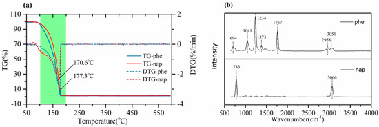 TG-FTIR analysis for thermal stability estimation of phenethyl acetate and naphthalene: (a) TG/DTG curves; (b) FTIR spectrogram.
