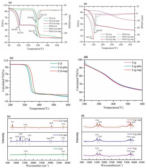 TG-FTIR analysis of the selected internal standards after mixing with cellulose or lignin: (a) TG/DTG curves of the internal standards blending with cellulose; (b) TG/DTG curves of the internal standards blending with lignin; (c) calculated TG curves of cellulose; (d) calculated TG curves of lignin; (e) FTIR spectrogram of the internal standards blending with cellulose; (f) FTIR spectrogram of the internal standards blending with lignin.