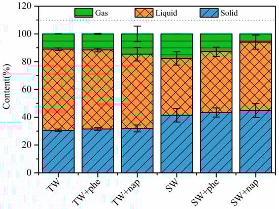 The yields of pyrolytic products during tobacco and sawdust waste pyrolysis with the addition of different standards.