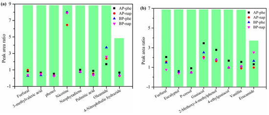 In order to better estimate the feasibility of adding standards into biowaste before pyrolysis for bio-oil quantitative analysis, eight typical components in the bio-oil from tobacco waste and sawdust waste were selected as evaluation substances. As depicted in Figure 4, peak area ratios were calculated based on the ratios of the peak area for each component to the peak area for internal standards (shown as Equation (2)). For tobacco waste, the peak ratio of 3-methylvaleric acid, phenol, neophytadiene, palmitic acid, 4-nitrophthalene dimethylamide from bio-oil in the two addition methods were basically close, indicating that the different addition methods have similar quantitative effects on the above five substances. However, for furfural, the quantitative ratio for adding internal standards after pyrolysis was higher than that before pyrolysis, which implied the corresponding correction factor would be lower under the same injection volume. In addition, different addition methods would have a certain bias effect on the quantification of nicotine and palmitic acid. Nevertheless, the addition of phenethyl acetate to nicotine could avoid the impact of different addition methods, and the addition of naphthalene to palmitic acid could avert the influence of different additions. Similarly, the furfural, eucalyptol, p-cresol, guaiacol, 2-methoxy-4-methylphenol, 4-ethylguaiacol, pandan and erucamide in the bio-oil of sawdust waste were analyzed through the ratio of the peak area of different components to the internal standard under different adding methods. The results revealed that the furfural produced by different raw material sources displayed a similar regular pattern. Moreover, the naphthalene could be chosen as the appropriate internal standard to quantify eucalyptol, p-cresol, guaiacol, 2-methoxy-4-methylphenol, 4-ethylguaiacol and vanillin, which showed certain advantages that would avoid the influence caused by different addition methods. On the other hand, the addition of phenethyl acetate before pyrolysis mostly appeared to have a lower area ratio than that of after pyrolysis, which could further lead the relative correction factor to be higher. For erucamide, the selection of suitable internal standards in different addition methods required further exploration. In short, it was advisable to add suitable internal standards before pyrolysis for quantifying the substances from bio-oil.