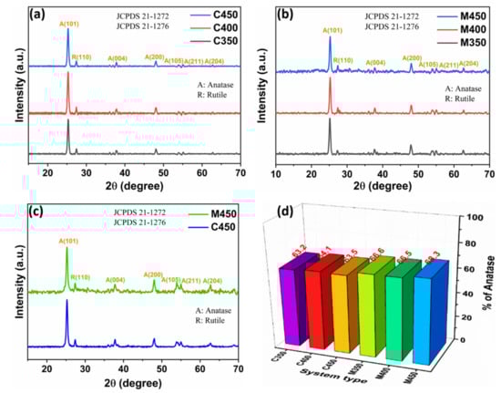 XRD patterns of (a) Conventional, (b) Microwave sintered titania films, (c) Conventional and microwave sintered films at 450 °C, and (d) Percentage of anatase phase.