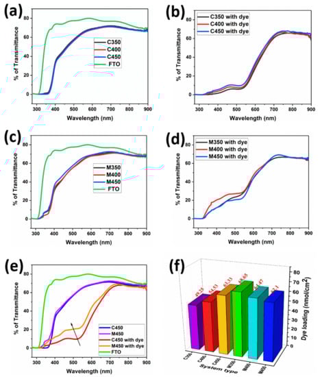 It is necessary to analyze the transmittance behavior of the films with and without dye loading to better understand the influence of film quality on the cells’ performance. Figure 2 shows that the various titania films’ transmittance spectra through microwave and conventional sintering processes with and without dye loading are noted. Figure 2a indicates the transmittance spectra of conventionally sintered films at different temperatures; bare FTO transmittance data was also included for reference. Primarily, it is observed that there is not much change in the transmittance for the C350, C400, and C450 samples. Figure 2b shows the transmittance spectra of the corresponding Figure 2a with dye loading. Figure 2c shows the transmittance spectra of microwave sintered films at different temperatures, with bare FTO reference. It is observed that there is a minute change in the transmittance for the M450 as compared to the M400 and M350 samples. Figure 2d indicates the corresponding Figure 2c transmittance spectra with dye loading. An exact understanding of samples C450 and M450 with and without dye adsorption is plotted separately and shown in Figure 2e. It is clearly understood that the transmittance of both C450 and M450 is the same without dye loading. However, there is a considerable change in the transmittance of C450 and M450 with dye loading, which is a crucial factor for more incident light to be able to pass through the film; thus, more electrons can be generated. This transmittance change may be due to the higher anatase phase existence in the M450 sample as compared to C450.