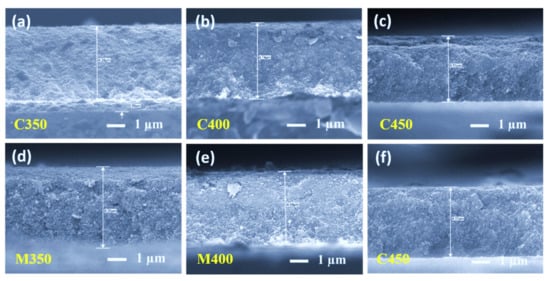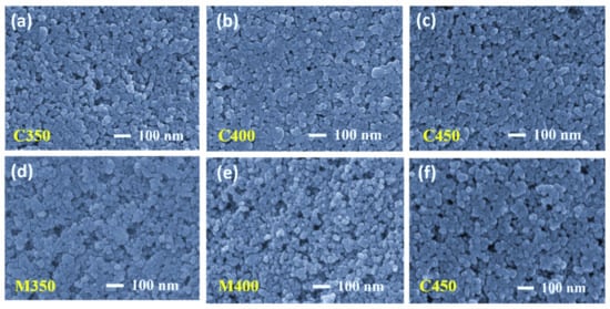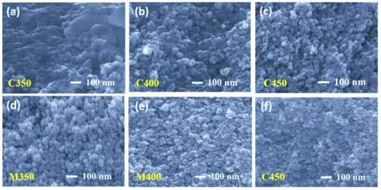 Fractography high-resolution images are presented in Figure 4. Careful observation leads us to conclude that the conventional sintered samples at 350 °C and 400 °C were still left with some organics present (Figure 4a,b respectively), and the sample sintered at 450 °C has only sintered TiO2 with dense packing (Figure 4c). The fractography images for the microwave sintered samples at the same temperatures as that of the conventional, at 350 °C and 400 °C, show the organic materials are entirely burnt out, leaving high porosity but low connectivity (Figure 4d,e). At 450 °C, microwave sintering the titania films has a little less porosity than M350 and M400, but better interconnectivity among TiO2 nanoparticles due to proper densification (Figure 4f). All microwave sintered samples at 350 °C, 400 °C, and 450 °C have better porosity than their counterparts in conventional sintering. These observations are also supported by the top view of the FEGSEM images presented in Figure 5a–f. This is because microwave sintering provides an instant heating effect locally in the samples, irrespective of materials thickness; microwaves can penetrate easily and produce a local heating effect. Thus, organics present in the coated film burn out faster, within minutes, and obtain uniform films with high porosity.