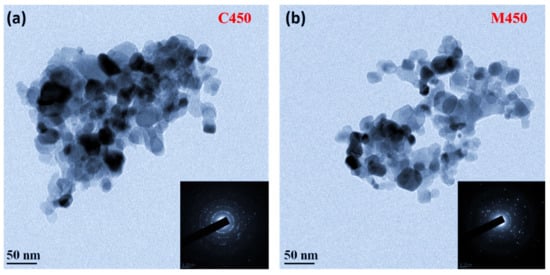Titania films were subjected to transmission electron microscopy analysis (TEM) to verify the influence of different heating processes on the interparticle connectivity of titania, which leads to the appropriate porosity and its impact on the performance of DSSCs. For this purpose, the sintered titania films were separated gently from the FTO substrates, sonicated in ethanol for 10 min, and given for the TEM analysis. Figure 6 indicates the TEM images of the samples C450 and M450 with selected area electron diffraction (SAED) patterns inset. It is well-observed from Figure 6 that the titania nanoparticles were well connected in the C450 and M450 cases. However, in the case of the conventionally sintered sample (C450), the particles were densely packed, leading to lost porosity.