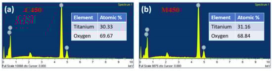 In contrast, microwave sintered samples (M450) were loosely packed without losing interparticle connectivity, leading to good porosity. This is because microwave sintering provides a fast heating effect locally in the samples, as described in the previous section. The SAED patterns of both samples show the samples’ polycrystalline nature; this is a good agreement with the XRD results. To confirm the samples’ present elements, an energy-dispersive X-ray spectroscopy (EDS) study was carried out, and the corresponding spectra, as shown in Figure 7. It is clear from the figure that both samples (C450 and M450) have pure titania and oxygen alone. No other element traces were found, which indicates the complete burning of the organics present in the titania slurry during the heat treatment process. However, there is a small change in the titania percentage in the microwave sintered sample (M450), which may be due to the high anatase phase existence of titania and is a good agreement with the XRD data.