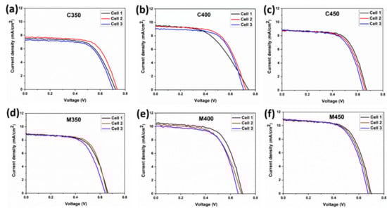 To understand the effect of microwave sintering in terms of device performance, the conventional and microwave sintered samples, as discussed above, are used for the photoanode preparation and respective fabricated DSSCs. To check these devices’ performance, J-V (current density vs. voltage) measurements were obtained with a solar simulator’s help. The recorded J-V curves for C350, C400, C450, M350, M400, and M450 are shown below in Figure 8a–e. Three cells are fabricated for each batch to check the repeatability, and the corresponding J-V curves are plotted in Figure 8. The observed cell parameters are expressed in Table 3. Figure 9a shows the J-V curves of the champion cells of the conventionally sintered titania-based DSSCs.