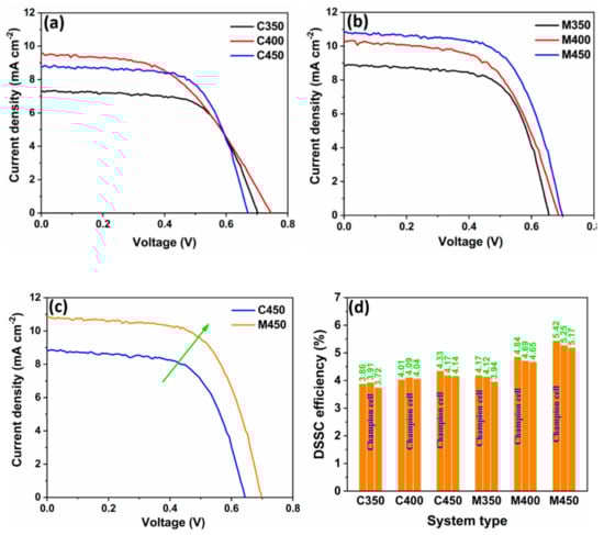 The loading of the dye (light-absorbing material) into the TiO2 porous structure is one of the critical parameters in DSSC performance. The conventional and microwave sintered samples that are discussed above are subjected to the dye loading by dipping into the N3 dye solution (0.3 mmol in ethanol) and left soaking for 24 h. During the soaking process, the organic N3 dye is adsorbed onto the porous TiO2 structures by filling pores. The amount of loaded dye is quantified by conducting dye-desorbing studies. These studies were carried out for both conventional and microwave sintered samples by dipping them in 5 mL of 1N NaOH solution in water. The desorbed dye dissolved in 5 mL NaOH solution was subjected to UV-Vis spectrophotometer studies at a particular wavelength of 500 nm by taking 1 mL of dye solution in the cuvette for concentration evolution []. Evaluated concentrations are tabulated below and plotted, as shown in Figure 2f. The conventional sintered samples C350, C400, and C450, have concentrations of 49.25, 54.53, and 63.33 nmol cm−2, respectively. C450 has a comparatively higher dye-loading capacity than the other two conventional sintering samples due to high porosity, making them adsorb more due to the high volume of surface area. The microwave sintered samples M350 and M400 have even higher dye content than C450 due to the even higher porosity described in the subsequent section with the help of FEGSEM images. The M450 sample has comparatively low dye-loading capacity, which is expected due to the better interconnectivity of the sintered TiO2, which makes less porosity available to dye to adsorb on. The effective electron transfer counterbalances the effect of sacrificed loaded-dye content due to the better interconnectivity of TiO2 in M450, which is shown in the form of device performance discussed in the subsequent section.