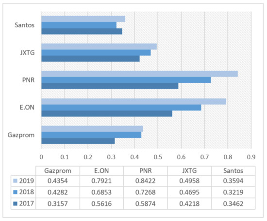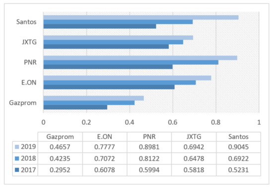 Under the pressure of the sustainable development paradigm, energy companies are forced to transform their operations (including changing approaches to the extraction and use of resources). In order to determine the need for transformation of accounting systems in this context, the financial results were assessed by taking into account the efficiency of sustainable development of the companies under study (Figure 2).