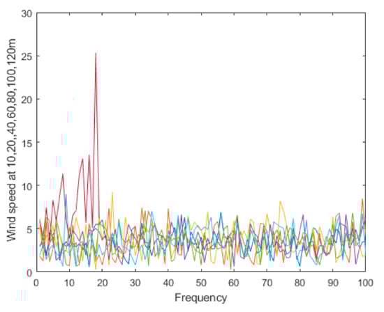 Graph of wind speed at 10, 20, 40, 60, 80, 100, and 120 m.