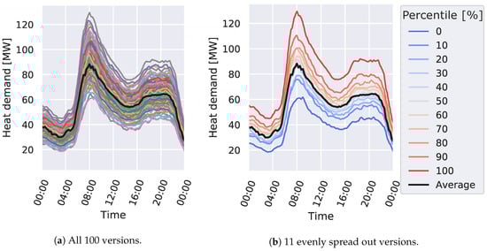 All of the GenkNET versions are ordered from low to high annual heat demand. Using this ordering, every tenth profile is selected, corresponding to the selection in Figure 5b. Hence, when ordered according to the annual heat demand, versions 0, 10, 20, 30, 40, 50, 60, 70, 80, 90, and 100 are chosen. These versions will be named by these numbers in the remainder of this study, with 0 corresponding to the GenkNET version with the lowest annual heat demand and 100 to the one with the highest annual heat demand. Note that the ordering of the profiles is the same for each of the six days and any other variation that is analysed in this study.