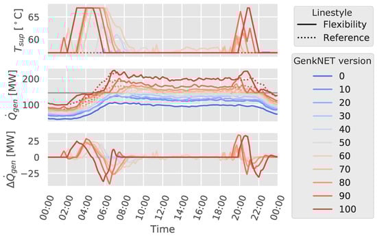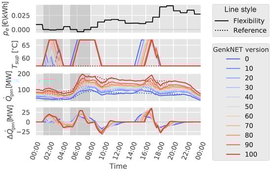 In Step 1 of the uncertainty analysis, the optimal control strategies of all 100 versions of GenkNET were calculated. Figure 6 shows the optimal control of the 11 selected versions on the Winter_Neg day (a winter day with an electricity price that becomes negative). These 11 versions are spread out over the entire range of heat demand magnitudes and they give a good overview of the optimal control of all versions. Figure 6 shows that the network is charged three times: during the two negative price periods and before a large change in electricity price. With the coefficient of performance (COP) reducing when the supply temperature is increased, which is inevitable when activating network flexibility, these are the only moments when network flexibility is profitable. In Figure 6, the Flexibility and Reference case refer to the cases in which network flexibility is available and in which it is unavailable, respectively.