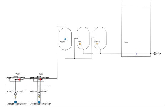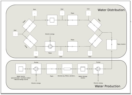 Water supply systems consist of water intake, treatment stations, and distribution systems. A water supply system scheme is presented in Figure 1.