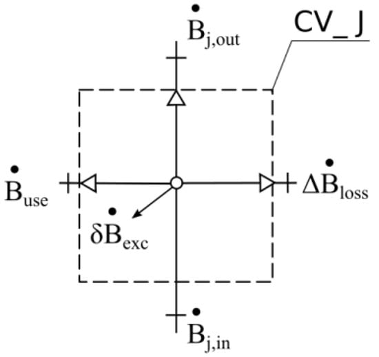 where is the rate of exergy inflow to the control volume CV_J [W], is the rate of exergy outflow from the control volume CV_J [W], is the rate of usable exergy outflow from the control volume CV_J [W], is the rate of external exergy destructions, caused by a loss of water mass because of leakage from the control volume CV_J [W], and is the rate of internal exergy destructions caused by excess pressure in the node [W].