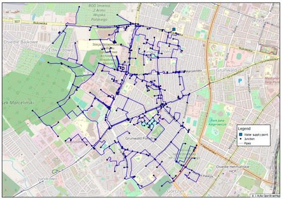 For research, the example of an “artificial” water supply network was generated. The network was generated using the DynaVIBe-Web software [,,]. This software allowed the generation of water supply system models automatically (e.g., for research purposes) based on a background map. The network consisted of 447 pipes (95 km) and 404 nodes. The roughness coefficients for pipes were 0.1–5 and the total water demand was 16,257 m3/day. The network scheme is presented in Figure 9.