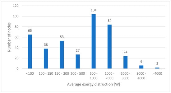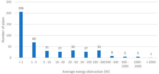 As analysed, the largest exergy destruction resulted from maintaining higher than the required pressure in the water-supply network. Exergy destruction in pipes has also significant impact on the exergy balance. Figure 11 shows the distribution of exergy losses caused by keeping the pressure in nodes higher than required. Figure 12 presents the distribution of exergy loss in pipes (due the friction).