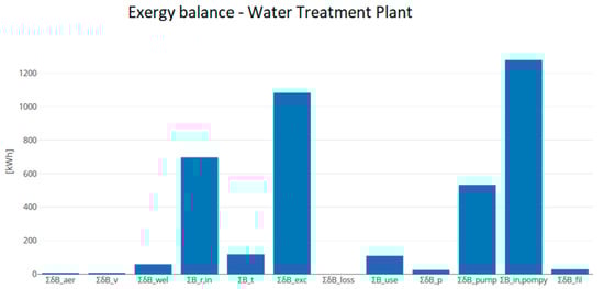 The results of the calculations were the exergy models for each element of the water treatment station. Figure S4 (attachment 1) presents units of exergy destructions (W/m3) in the water treatment plant. For the complex evaluation of the overall system, exergy balance was developed based on Equation (33):