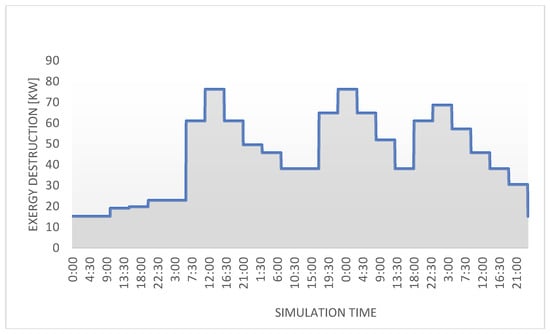 The analysis shows that the biggest exergy destruction resulted from maintaining a higher than required pressure at the station outlet. Figure 15 presents the rate of exergy destruction during simulation time.