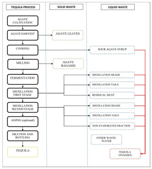 Tequila is a Mexican beverage protected by Origin Denomination, its production and commercialization are verified and certified by Tequila Regulating Council (CRT) [1,2]. The tequila production process consists of Agave tequilana Weber sugars extraction, by hydrolysis or cooking followed by milling to obtain agave juice for further fermentation, distillation, mixing, aging, and bottling. Tequila has two categories: “Tequila 100% agave” and “Tequila” (which is made with a minimum 51% agave reducing sugars and generally completed with cane sugar). It also produces the following residues: agave leaves, agave bagasse, and tequila vinasses [1,2,3,4].