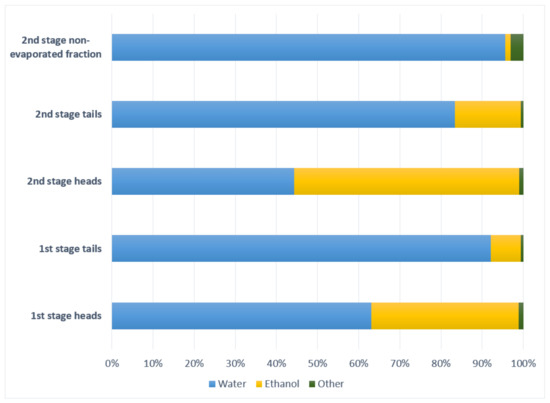 Ethanol (boiling point 78.37 °C) is present in major proportion in second stage heads, followed by first stage heads, second stage tails, first stage tails and second stage non-evaporated fraction, is proportional with temperature and coincident with Darici, et al. [24].