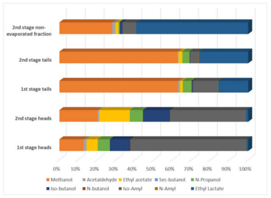 Methanol, although has a lower boiling point (64.7 °C) than ethanol, is present in mayor proportion in first and second stage tails and second stage non-evaporated fraction, being the minor proportion reported in first and second stage heads, contrary to Darici, et al. [24] reported data.