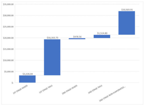 For a medium size tequila factory, it is common an approximate production of 1 × 105 L tequila (40%A.V.) per month, this quantity will be used for analysis. In Table 6 is indicated the approximate volume for each stream and the range of price calculated, Figure 5 shows a mean pricing for each stream.