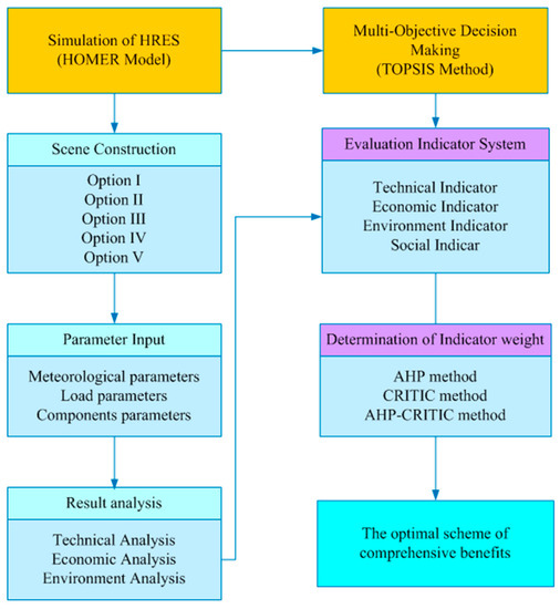 This paper proposes an evaluation method combining the HOMER model and the TOPSIS method. Generally, a large amount of heat energy will be released in the process of coal-fired power production in China, which is used as a by-product of electric energy to provide heating services. Since this study focuses on the optimization of the power system, the research does not consider the heat energy supply. The energy system consists of the already-produced power to the end-users. In this text, the HOMER model is used to simulate different scenarios in the research area, and the simulation results are evaluated as options. The TOPSIS method is utilized to rank the HRES options, considering all aspects affecting HRES selection. In the decision-making process of the TOPSIS method, three different weighting methods are proposed—the AHP method, CRITIC method, and AHP-CRITIC method—which represent subjective empowerment, objective empowerment and the combination of subjective and objective empowerment. Figure 1 shows a flow chart of this method, and the details of each step are presented in the following sections.