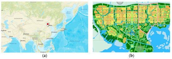 The plan involves developing the XND area in advance, starting with specific areas, and the planned start-up area of the XND area is 38 km2, in which the planned construction land area is 26 km2, accounting for 68.4% of the total planning area according to the local regulations published in [29]. This area will inherit the non-capital function stock of Beijing and effectively attract part of the population of Beijing, thereby accruing highly skilled workers, and a population structure that is compatible with the function positioning of innovative intelligence and other new areas will gradually form to satisfy the development needs of high-end and prosperous industries. This paper selects this area as the research area, and Figure 2 shows the detailed information of the research area in this study. The sources of the pictures on the left and right of Figure 2 are HOMER and the Planning Outline of the XND area in Hebei Province [30], respectively.