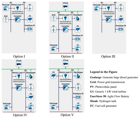 According to the construction plan, the XND area will realize a 100% clean power supply and become the first urban power grid with a continuous 100% clean power supply. This plan will enable clean power consumption to account for 52% of the final energy consumption. To fulfil this purpose, it is necessary to make full use of local renewable resources to optimize the power system configuration. The policy planning outline (Hebei 2017) shows that clean energy sources include wind, solar, hydrogen, and other renewable energy with no waste. In view of the dense population, nuclear power is not feasible in the XND. This paper applied HOMER to simulate HRESs with different storage modes, including battery and hydrogen energy storage equipment, which are applied to solve the problems of excess electricity and power output volatility. In the present study, PV panels, wind turbines, batteries, fuel cells, electrolytic cells, hydrogen tanks, converters, and diesel generators constitute the candidate components of the HRES options. This study constructed five different scenarios in the XND area, including a grid-connected HRES with a battery storage mode (option I), a grid-connected HRES with a hydrogen storage mode (option II), an off-grid HRES with a battery storage mode (option III), an off-grid HRES with a hydrogen storage mode (option IV), and an off-grid HRES with modes that combine battery and hydrogen storage (V). Figure 3 shows the detailed configurations of the above systems.