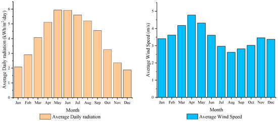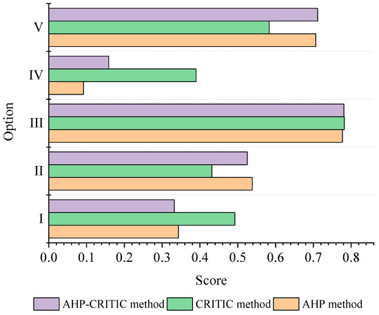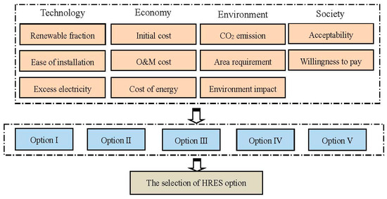 The priority of a candidate option in HOMER is determined by the principle of the minimum NPC. Thus, HOMER is a great tool for simulating scenarios in undeveloped areas where the economy and technology are the obvious limiting factors for local development. However, for developed areas, the limiting factors may be the society and environment, rather than the economy and technology. Although some predecessors have used the method of combining TOPSIS and HOMER to evaluate HOMER simulation results, these studies have some shortcomings, which can be divided into two categories. First, these studies did not consider the impacts of local policies on system selection [26]. For example, political willingness plays a special role in regional development in China. This method considers comprehensive indicators affecting the selection of HRES options, including economic (the initial cost, O&M cost and COE), technological (renewable fraction, ease of installation and excess electricity), environmental (CO2 emissions, area requirements and environmental impact) and social (acceptability and willingness to pay) factors. Different from previous studies, social indicators related to local energy policies are included in the index evaluation system for the first time. In addition, the subjective weighting method represented by the AHP method has strong subjectivity, which ignores the variability and conflict within indicator elements. Second, the objective weighting method represented by the CRITIC method has strong subjectivity, which is not in line with the reality of real-world decision-making [28]. Thus, using only subjective weighting or objective weighting can introduce certain errors into the results.
