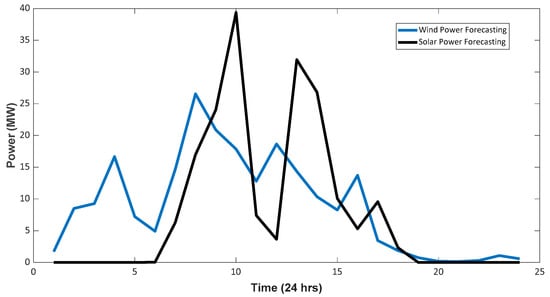 In the case of RESs, the generating cost parameter is not taken into account. The RESs that are considered in this research are wind energy and solar PV energy, whose forecasting is taken from [43] and is shown in Figure 1. A comprehensive review of the forecasting approaches for wind and solar power generation can be found in [46].