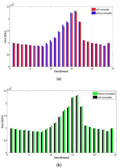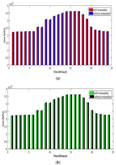 Cost offered by (a) BA and (b) dBA without and with considering renewables.