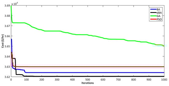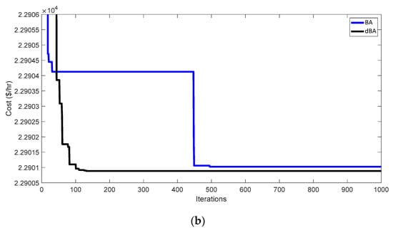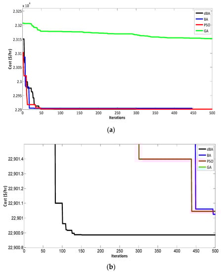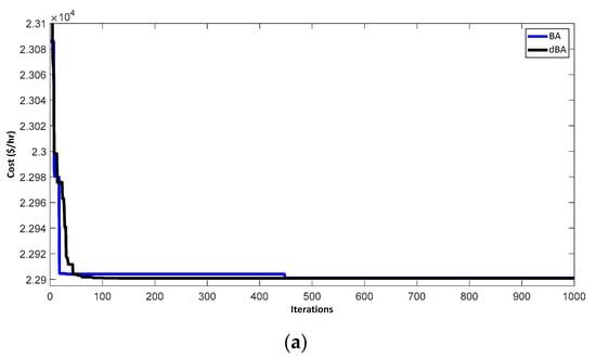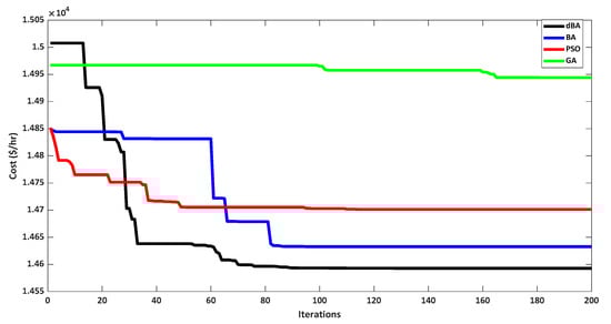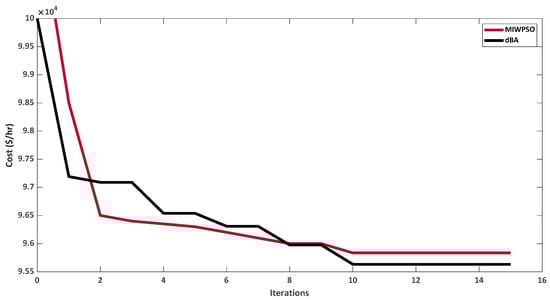 A comparison of the results offered by the dBA and other algorithms such as the BA, GA, PSO, and modified inertial weight-based PSO (MIW-PSO) is presented in Table 22. The dBA offers a low cost, i.e., 95,633 $/h when compared to all other mentioned techniques, thus validating the workability of the dBA. This low cost is also depicted in the convergence characteristics drawn for the dBA and MIWPSO, as shown in Figure 22. For the comparison purpose, the convergence characteristics are drawn for 15 iterations.