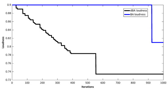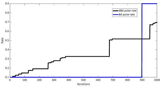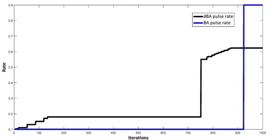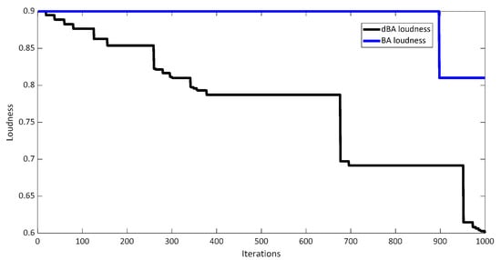 Figure 5, Figure 6, Figure 7, Figure 8 and Figure 9 show the various characteristics of the BA and dBA against test case 1. Figure 5 and Figure 6 show the position of bats for the BA and dBA, respectively. As shown, bats start from random locations (initial solutions) and converge to the best solution after 1000 iterations. However, in the case of dBA, the bats are much better optimized. Figure 7a shows that fitness offered by the BA decreases quickly, which increases the risk of trapping the optimal solution in the local optimum. However, fitness gradually decreases as the iterations progress in the case of dBA. It has a better chance of moving closer to the global optimum. Figure 7b shows the magnified view of the cost convergence curve. Figure 8 shows the pulse rate of the best bat which depicts the decrease of pulse rate as the bat finds its prey. Figure 9 shows the best bat’s loudness, which depicts the increase of loudness as the bat finds its prey.