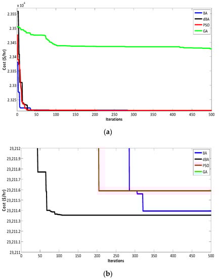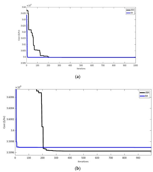 Convergence curve: (a) The cost convergence curve by the BA and dBA (seven-unit system with renewables); (b) Magnitude view.