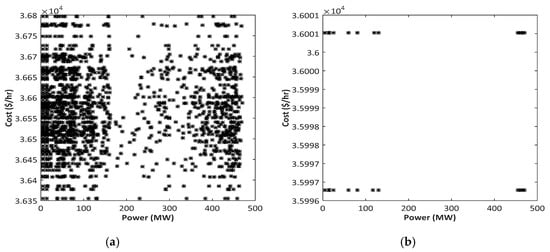 Bats positions in the BA (a) at the start and (b) after 1000 iterations (seven-unit system with renewables).