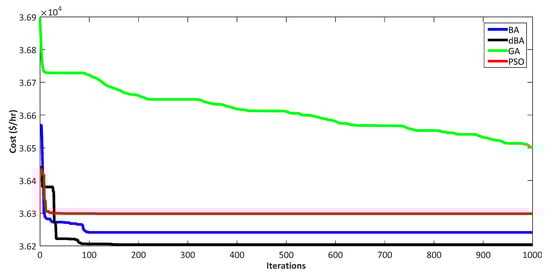To further justify the effectiveness of the dBA over BA and other metaheuristic techniques like PSO and GA, a test case of 1800 MW was taken with 100 population and 1000 iterations. Table 5 and Table 6 show the results regarding cost without and with renewables, respectively. It can be seen that the dBA is better when compared to BA, which in turn dominates PSO and GA. Figure 10 shows the convergence graph without renewables, whereas Figure 11 shows the convergence with renewables.