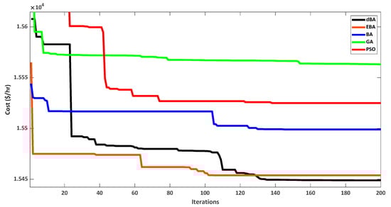 To further justify the effectiveness of the dBA over the BA, PSO, GA, and enhanced bat algorithm (EBA) (another variant of BA), a test case of 1263 MW was taken. A population size of 50 and 200 iterations were taken for this case for all algorithms. The dBA was compared with the EBA, BA, PSO, and GA for an ELD problem without and with renewables. In [26], the EBA is already applied to the same 6-unit thermal system, taking the valve point effect. The parameters used for the EBA are the following: fmin = 0, fmax = 2, r0 = 0.5, A0 = 0.9, learning factor (ῤinit) = 0.65, and modulation Index (n) = 3. Table 19 shows a comparison of all mentioned techniques for the demand of 1263 MW. It can be seen that the dBA gives the lowest value when compared to other metaheuristic techniques. Table 20 shows a comparison of the same techniques without the EBA for a demand of 1263 MW. It can be seen that the dBA still gives the lowest value when compared to other metaheuristic techniques. Figure 20 shows the convergence graph without renewables, whereas Figure 21 shows the convergence with renewables, both for a load demand of 1263 MW.
