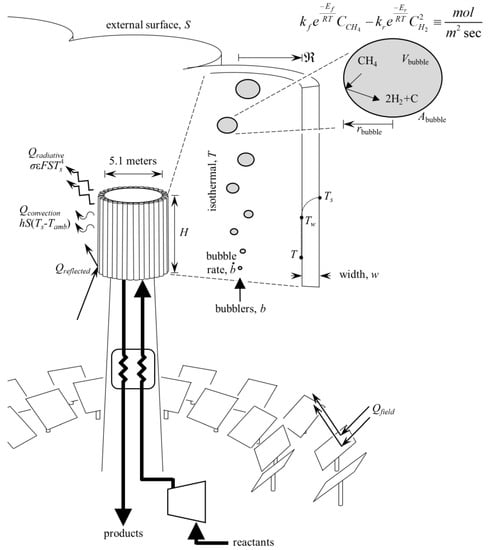 Exterior solar illumination must trespass multiple thermal barriers to heat reacting methane (Figure 1), barriers that limit solar energy ingress [15]. Such indirect solar heating is known to be limiting in solar reactor and thermal systems [40,41]. Conversely, bubbling molten metals rapidly transport thermal energy through strong convection and conduction (Metals, 1954). Thus, temperature was considered isothermal in the liquid metal catalyst, but likely barriers to solar heat were modeled in the reactor geometry presented in Figure 1. Specifically, Solar Two was a ø5.1 m circular receiver lined with Inconel tubes and we adopt the same configuration here [14], but vary reaction tube radius from 1 cm to the maximal extrusions considered feasible in Inconel piping manufacture (0.5 m) [42]. In the beam-down configuration, tubes were heated from cavity internal surfaces, versus externally in the original Solar Two power tower design. Losses through natural convection to ambient air around the receiver exterior surface S were modeled as previously described for concentrated solar facilities [43]: