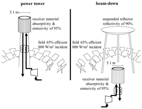 where the effective receiver absorptivity α was found from 2D Monte Carlo ray tracing. The 0.65 multiplicand originated from heliostat field efficiency [47,48,49]. For beam-down designs, this field efficiency was 10% lower to account for the redirection of light from a suspended reflector [52,53]: