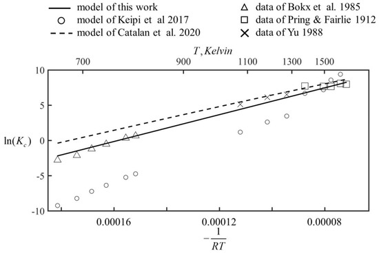 An Arrhenius plot of reaction equilibrium constant Kc predictions from reversible methane cracking kinetic models compared to published equilibrium data from experiments [28,29,30,55,56].